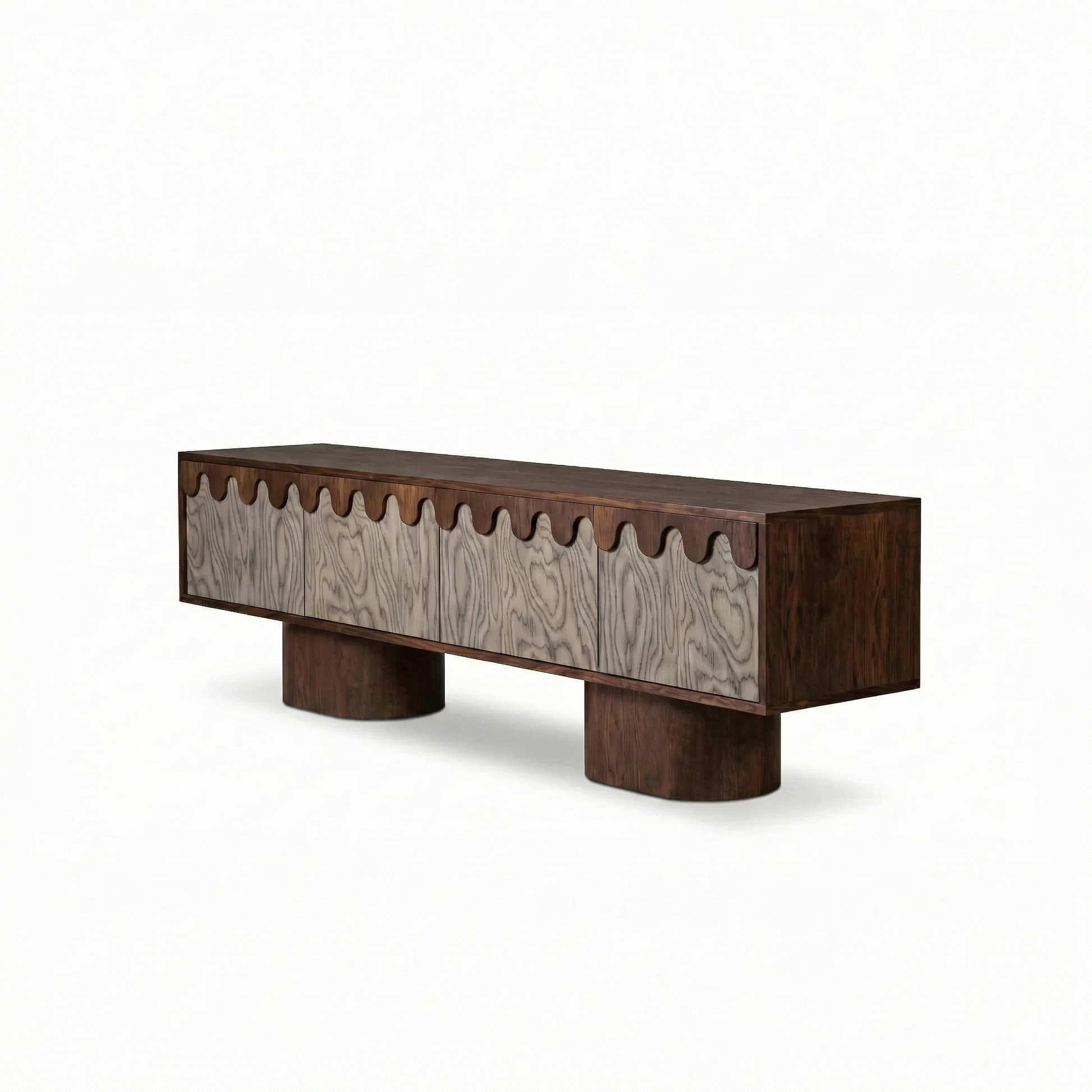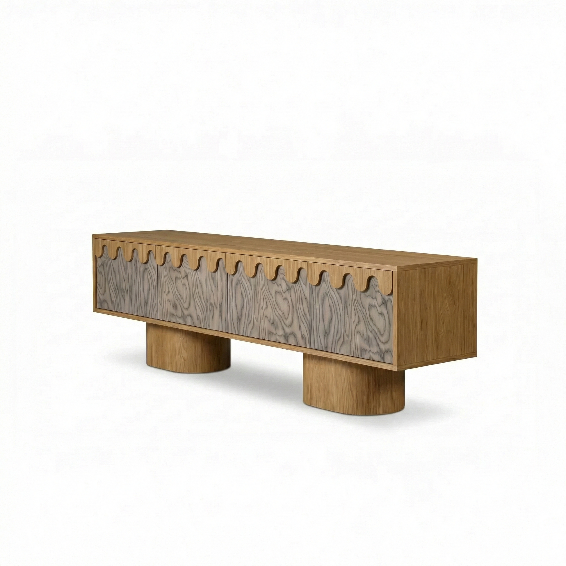 Komoda wykonana jest z litej konstrukcji drewnianej, wykończonej naturalnym fornirem wysokiej jakości, który pięknie eksponuje rysunek słojów. Kontrast pomiędzy ciemniejszym korpusem a jaśniejszymi frontami nadaje całości ponadczasowy charakter, a masywne, cylindryczne nogi podkreślają stabilność i architektoniczny wyraz mebla.